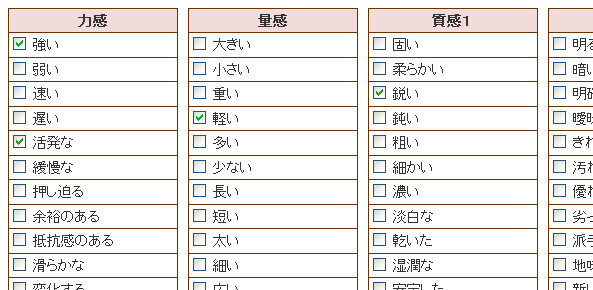 68種のコンセプトの中から、語感分析の対象となる実体のもつコンセプト(商品名・会社名などで表現したいイメージ)を指定することができます。コンセプトの指定数に制限はありません。
