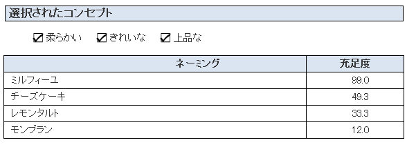 指定されたコンセプトに対して充足度が算出されます。複数のネーミングの充足度を比較することができますので、ネーミングの絞り込みに効果を発揮します。