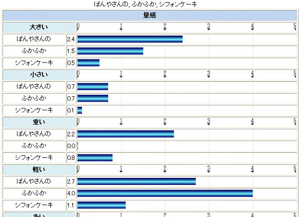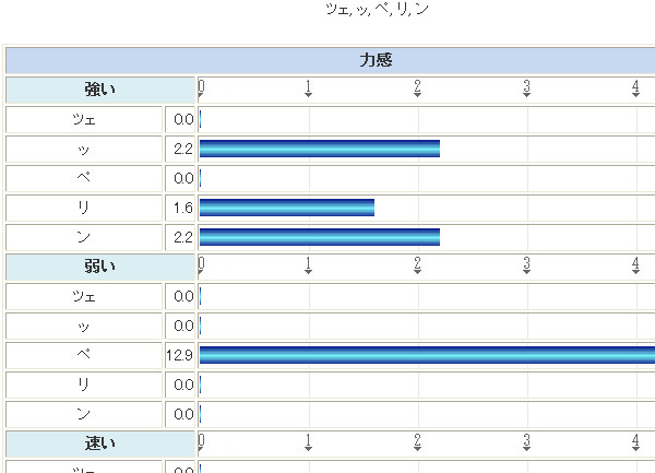 私たちは無意識のうちに音の切れ目や意味を考えながら言葉の音を聞いているため、いくつかの音の塊りが複合した言葉では、分割して分析する必要があります。「パン屋さんのふかふかシフォンケーキ」→「ぱんやさんの,ふかふか,シフォンケーキ」のように「改行」「,」「、」のいずれかで区切って入力することでひとつの言葉を分割して分析し、“語感の流れ”を把握することができます。「語感フロー分析」では68種の語感について数値と棒グラフを出力します。
